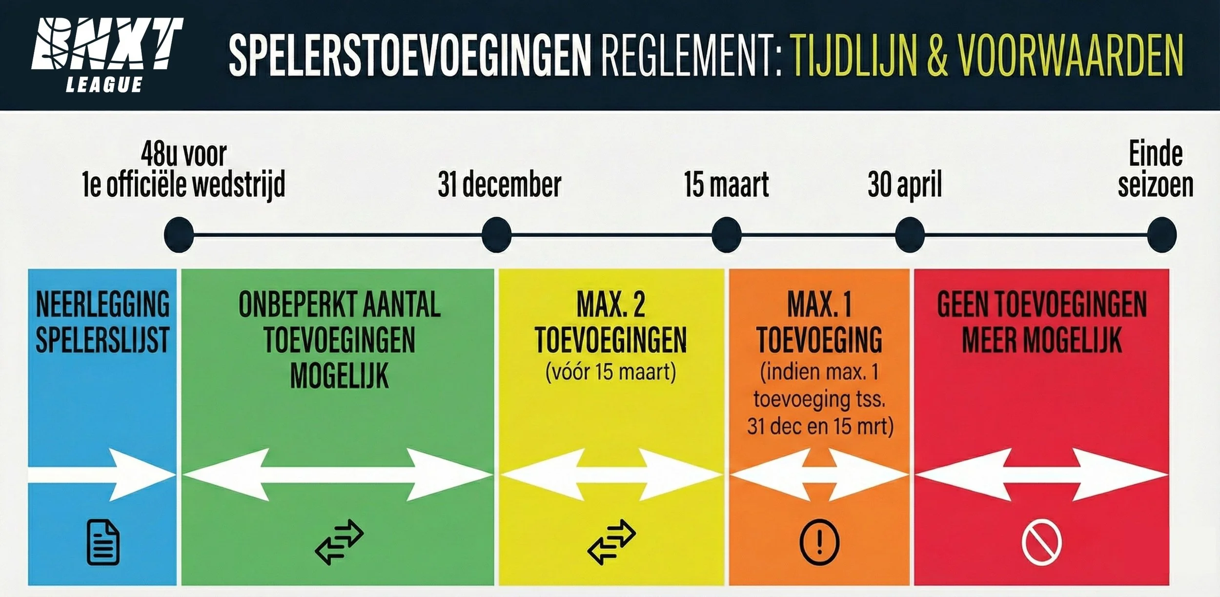 Maar wat zijn eigenlijk de regels voor transfers in de BNXT League? Die afspraken zijn te vinden in het huishoudelijk reglement van de League. Onderstaande tabel geeft duidelijk weer in welke periode welke transfers gedaan kunnen worden.